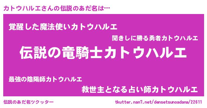 | 男性向けラノベタイトル風あだ名 | 『カトウハルエスレイヤー』 |