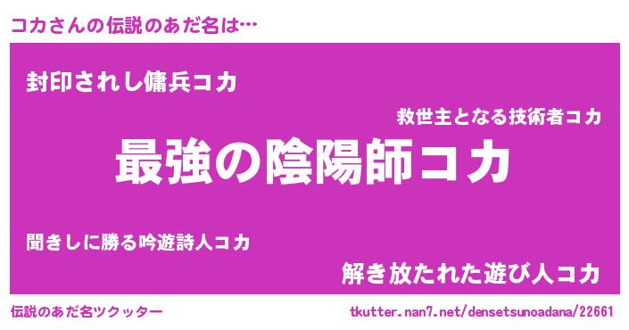 | 男性向けラノベタイトル風あだ名 | 『この素晴らしい世界にコカを!』 |