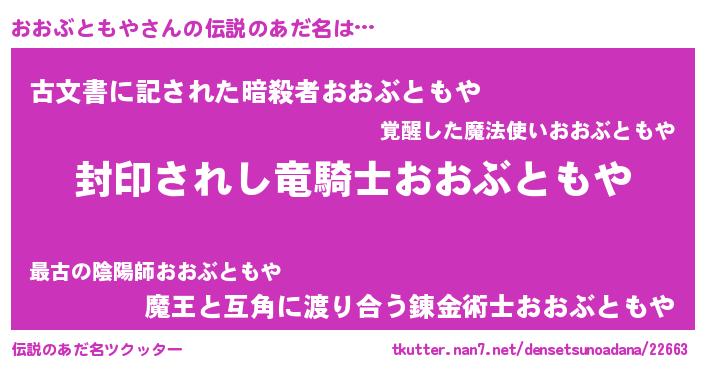 | 男性向けラノベタイトル風あだ名 | 『オオブトモヤアートオンライン』 |
