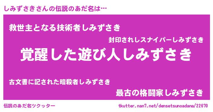 | 胡散臭い通販商品みたいなあだ名 | 『あなたにだけ特別に提供する世界で10本だけ現存している希少なブランデー…その名も「しみずさき」』 |