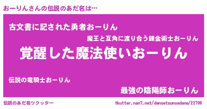 | 男性向けラノベタイトル風あだ名 | 『うちのおーりんが世界を掌握している!』 |