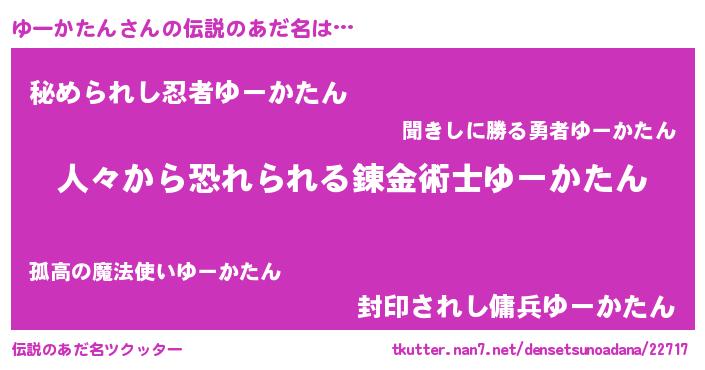 | 男性向けラノベタイトル風あだ名 | 『おまえをオタクにしてやるから、俺をゆーかたんにしてくれ! 』 |