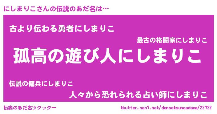| 男性向けラノベタイトル風あだ名 | 『ニシマリコスレイヤー』 |
