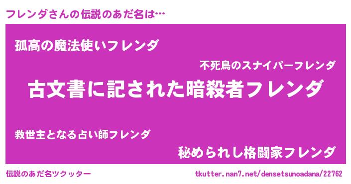 | 男性向けラノベタイトル風あだ名 | 『この素晴らしい世界にフレンダを!』 |