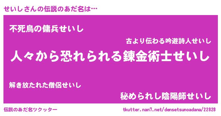 | 男性向けラノベタイトル風あだ名 | 『セイシスレイヤー』『せいしの憂鬱』 |