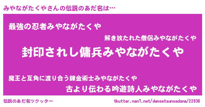 | 男性向けラノベタイトル風あだ名 | 『みやながたくやに滅ぼされるだけの簡単なお仕事です』 |
