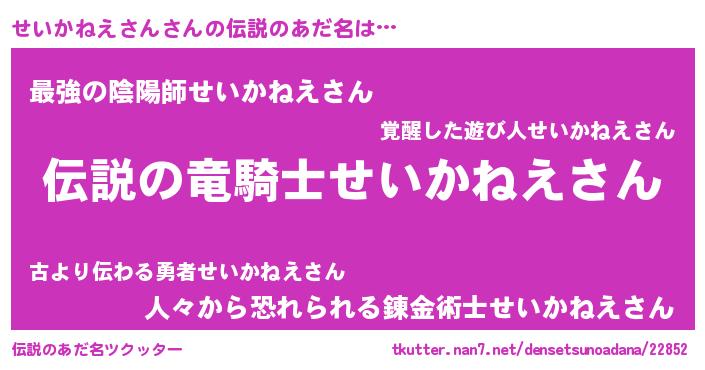 | 男性向けラノベタイトル風あだ名 | 『セイカネエサンスレイヤー』 |