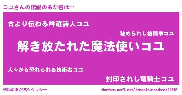 | 女子向けラノベタイトル風あだ名 | 『闇のコユ』『コユの卵を拾いまして』 |