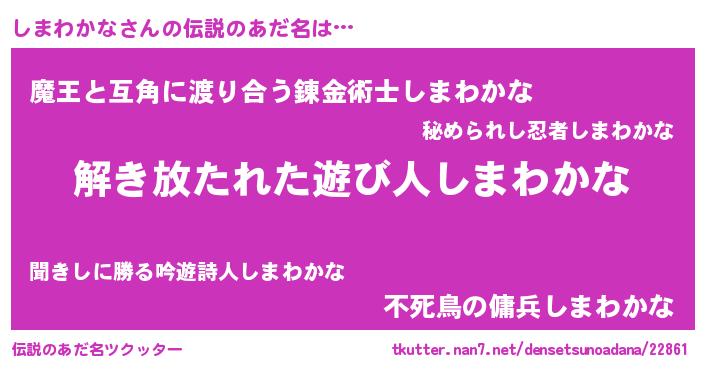 | 意味不明あだ名 | 『自称しまわかな』 |