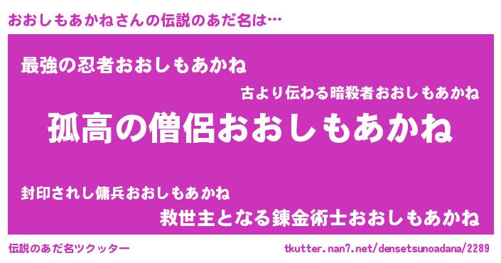 | 男性向けラノベタイトル風あだ名 | 『オオシモアカネスレイヤー』 |