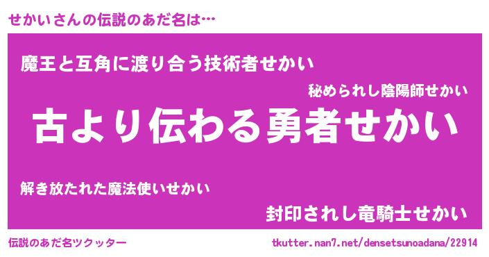 | 意味不明あだ名 | 『永久保存せかい』『自称せかい』 |