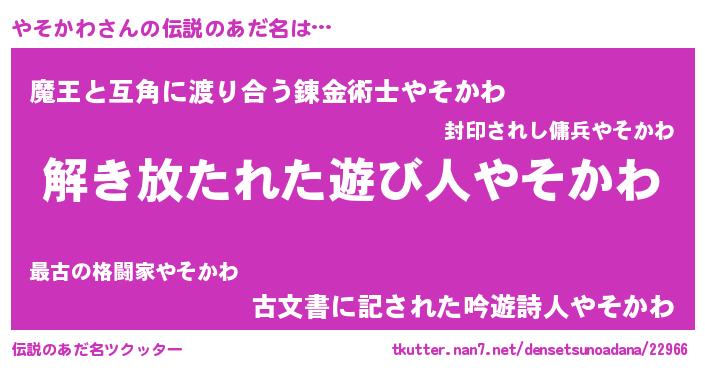 | 男性向けラノベタイトル風あだ名 | 『Re:やそかわから始める異世界生活』 |