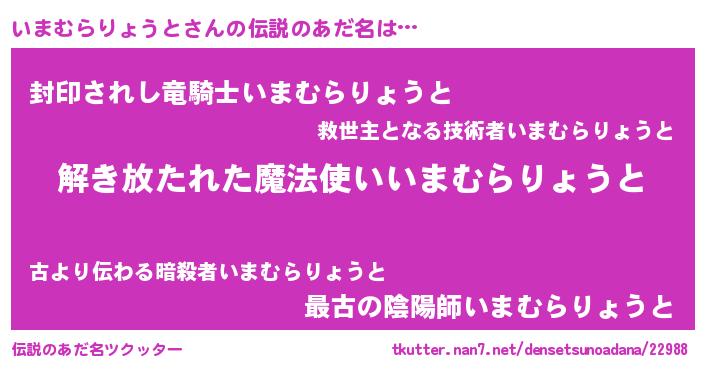 | 女子向けラノベタイトル風あだ名 | 『乙女ゲームの破滅フラグしかない悪役いまむらりょうとに転生してしまった…』 |