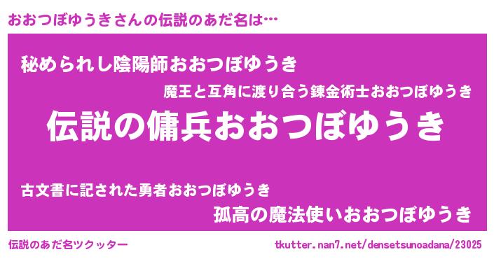 | 男性向けラノベタイトル風あだ名 | 『オオツボユウキスレイヤー』 |
