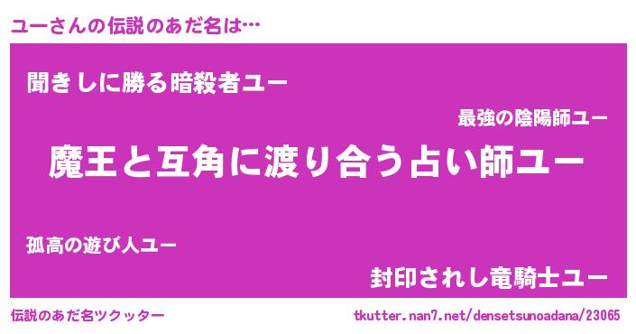 | 女子向けラノベタイトル風あだ名 | 『ユー恋絵巻』『首の姫と首なしユー』 |