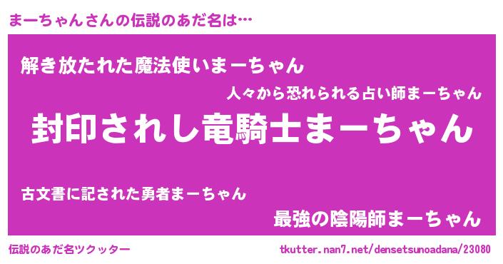 | 男性向けラノベタイトル風あだ名 | 『この素晴らしい世界にまーちゃんを!』 |