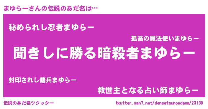 | 男性向けラノベタイトル風あだ名 | 『まゆらーという概念が存在しない退屈な世界 』 |