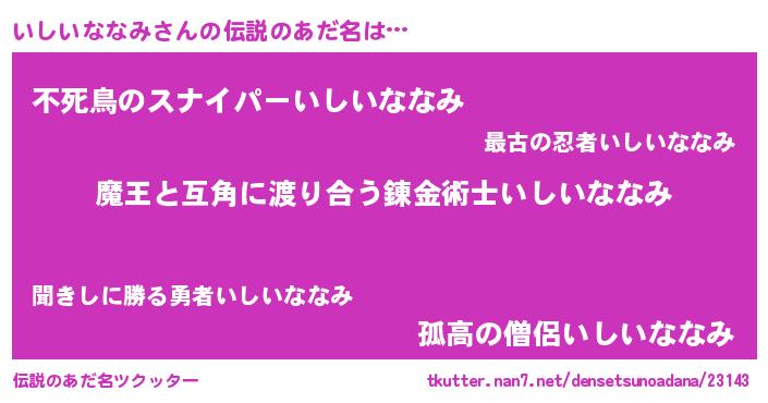 | 男性向けラノベタイトル風あだ名 | 『おまえをオタクにしてやるから、俺をいしいななみにしてくれ! 』 |