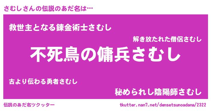 | 男性向けラノベタイトル風あだ名 | 『さむしに滅ぼされるだけの簡単なお仕事です』 |