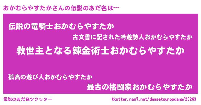 | 男性向けラノベタイトル風あだ名 | 『ノーゲーム・ノーオカムラヤスタカ』 |