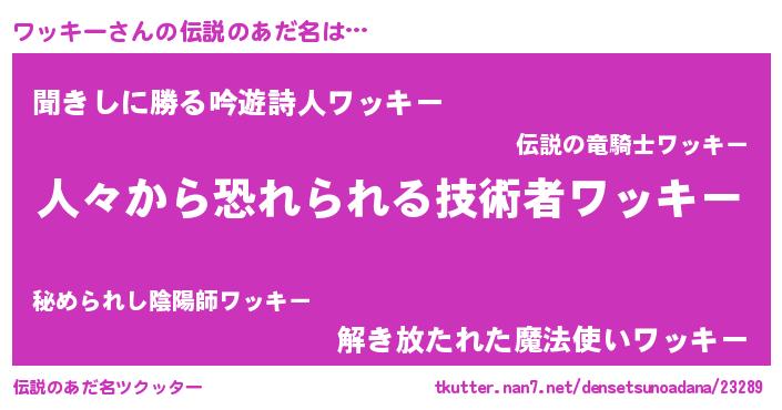 | 男性向けラノベタイトル風あだ名 | 『おまえをオタクにしてやるから、俺をワッキーにしてくれ! 』 |