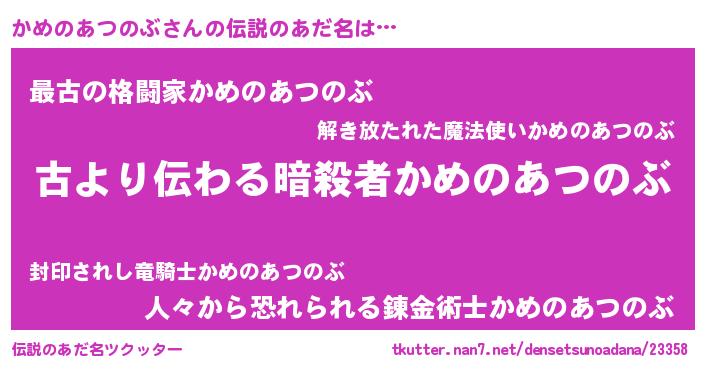 | 意味不明あだ名 | 『自称かめのあつのぶ』 |