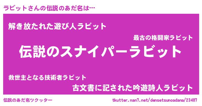 | 男性向けラノベタイトル風あだ名 | 『ラビットスレイヤー』『ラビットの憂鬱』 |