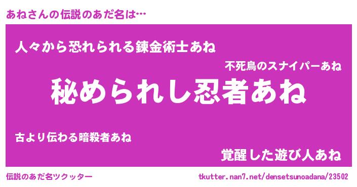 | 女子向けラノベタイトル風あだ名 | 『あねの雑貨屋さん』 |