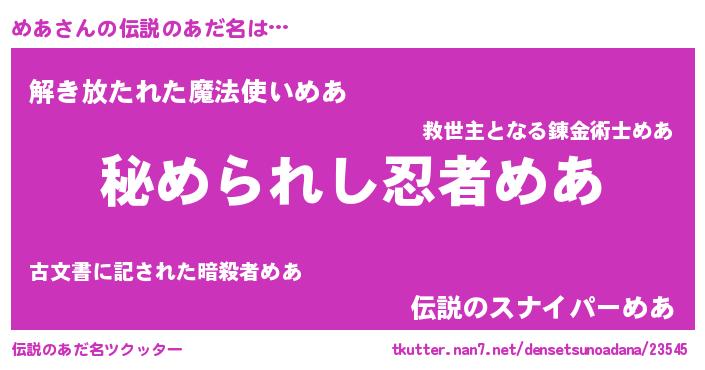 | ヒーロー風カッコイイあだ名 | 『ウルトラめあマン』『仮面メアダー』 |