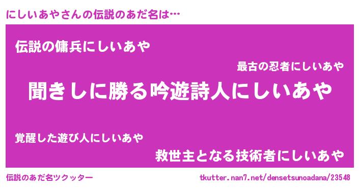 | 意味不明あだ名 | 『自称にしいあや』『永久保存にしいあや』 |