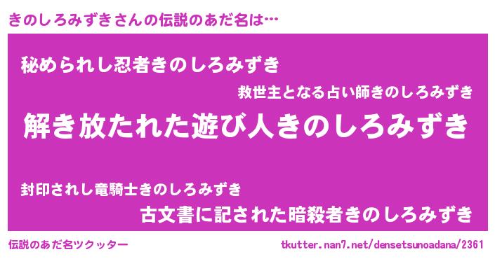 | 意味不明あだ名 | 『とにかく怪しいきのしろみずき』 |