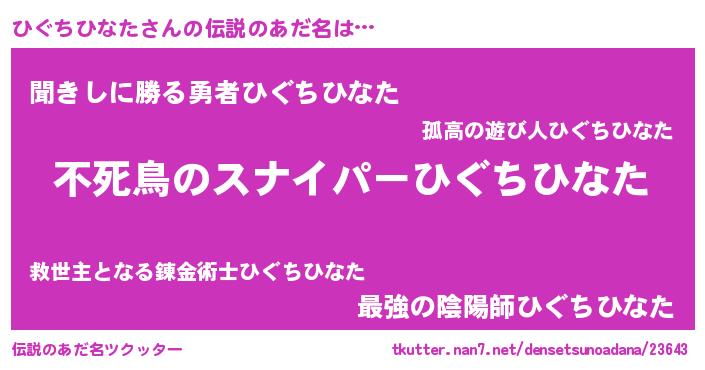 | 意味不明あだ名 | 『住所不定無職ひぐちひなた(85歳)』 |