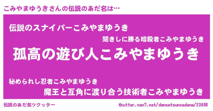 | 男性向けラノベタイトル風あだ名 | 『魔弾の王とこみやまゆうき』 |