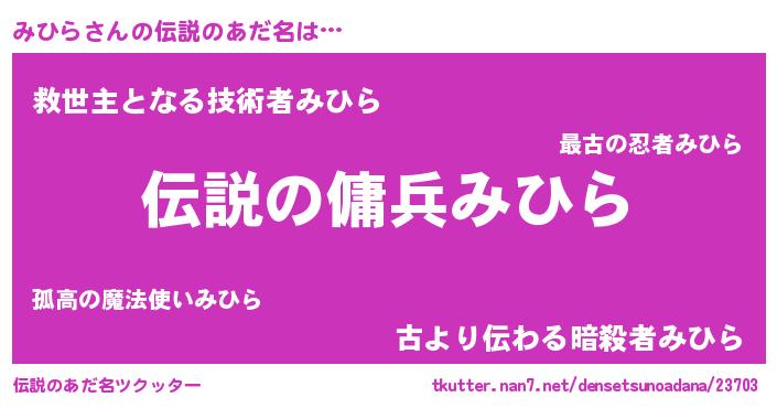 | 男性向けラノベタイトル風あだ名 | 『みひらの憂鬱』『ミヒラスレイヤー』 |