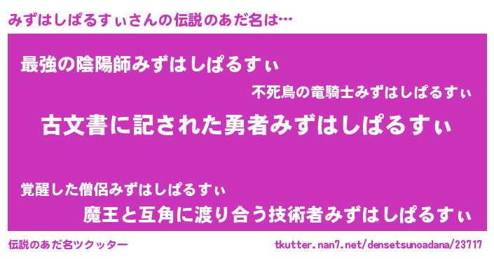 | 男性向けラノベタイトル風あだ名 | 『みずはしぱるすぃに滅ぼされるだけの簡単なお仕事です』 |