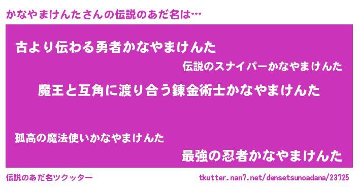 | 男性向けラノベタイトル風あだ名 | 『ノーゲーム・ノーカナヤマケンタ』 |