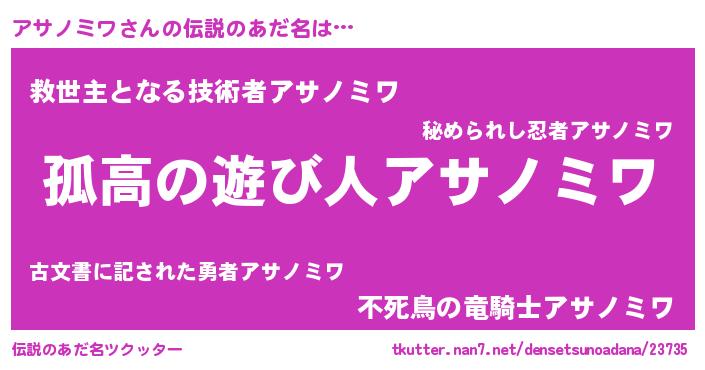 | 意味不明あだ名 | 『とにかく怪しいアサノミワ』 |