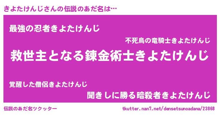 | 男性向けラノベタイトル風あだ名 | 『ノーゲーム・ノーキヨタケンジ』 |