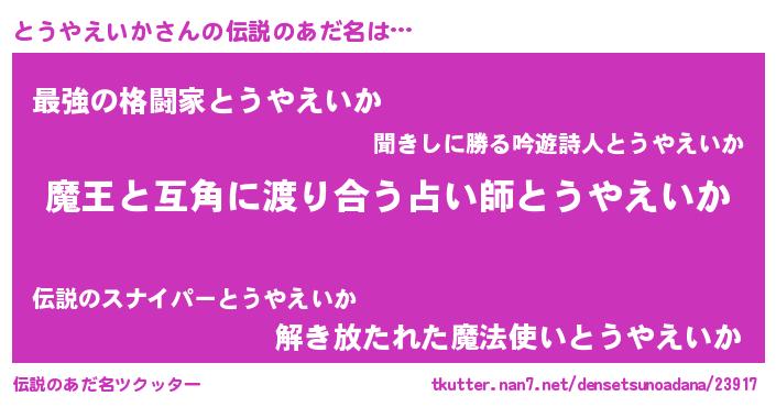 | 男性向けラノベタイトル風あだ名 | 『冴えないとうやえいかの育てかた』 |