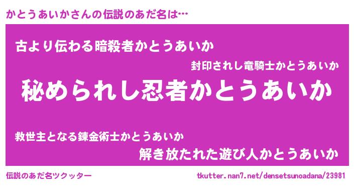 | ヒーロー風カッコイイあだ名 | 『ウルトラ戦士カトウアイカ』 |