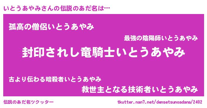 | 男性向けラノベタイトル風あだ名 | 『イトウアヤミアートオンライン』 |