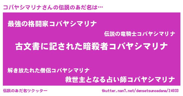 | 男性向けラノベタイトル風あだ名 | 『Re:コバヤシマリナから始める異世界生活』 |
