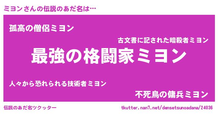 | 男性向けラノベタイトル風あだ名 | 『ミヨンに滅ぼされるだけの簡単なお仕事です』 |