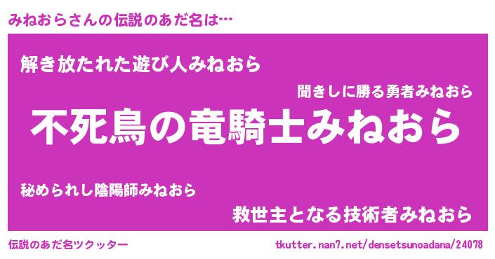 | 女子向けラノベタイトル風あだ名 | 『みねおら姫と円卓の騎士』 |