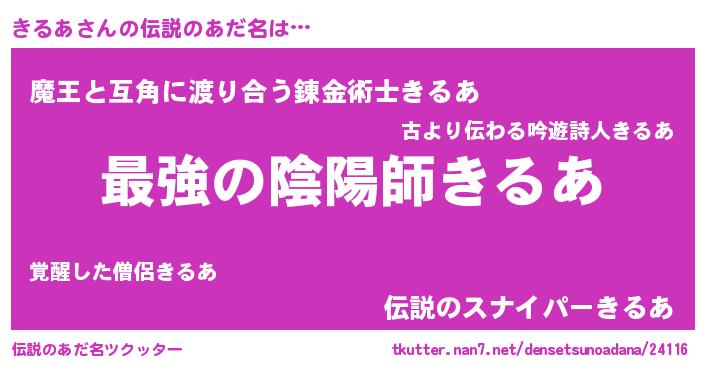| 男性向けラノベタイトル風あだ名 | 『きるあ~年齢イコール彼女いない歴の魔法使い~』 |