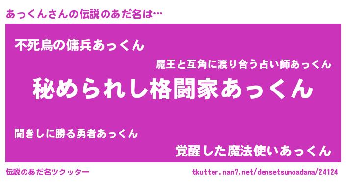 | 男性向けラノベタイトル風あだ名 | 『魔弾の王とあっくん』 |