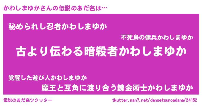 | 男性向けラノベタイトル風あだ名 | 『この素晴らしい世界にかわしまゆかを!』 |