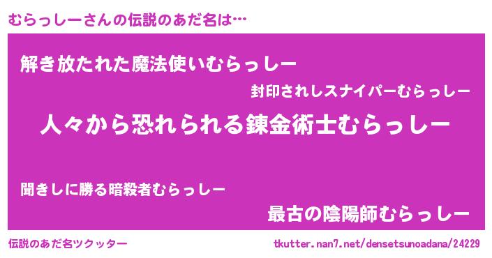 | 男性向けラノベタイトル風あだ名 | 『おまえをオタクにしてやるから、俺をむらっしーにしてくれ! 』 |