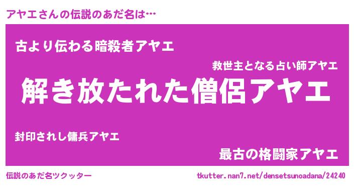 | 男性向けラノベタイトル風あだ名 | 『アヤエの嫁は女の子じゃないと思った?』 |