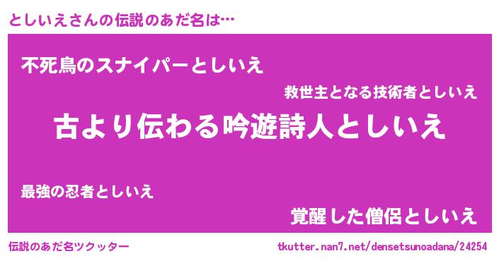 | 意味不明あだ名 | 『永久保存としいえ』『ペロリンとしいえ』 |